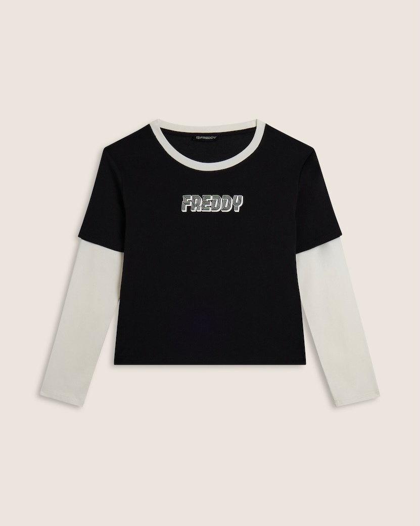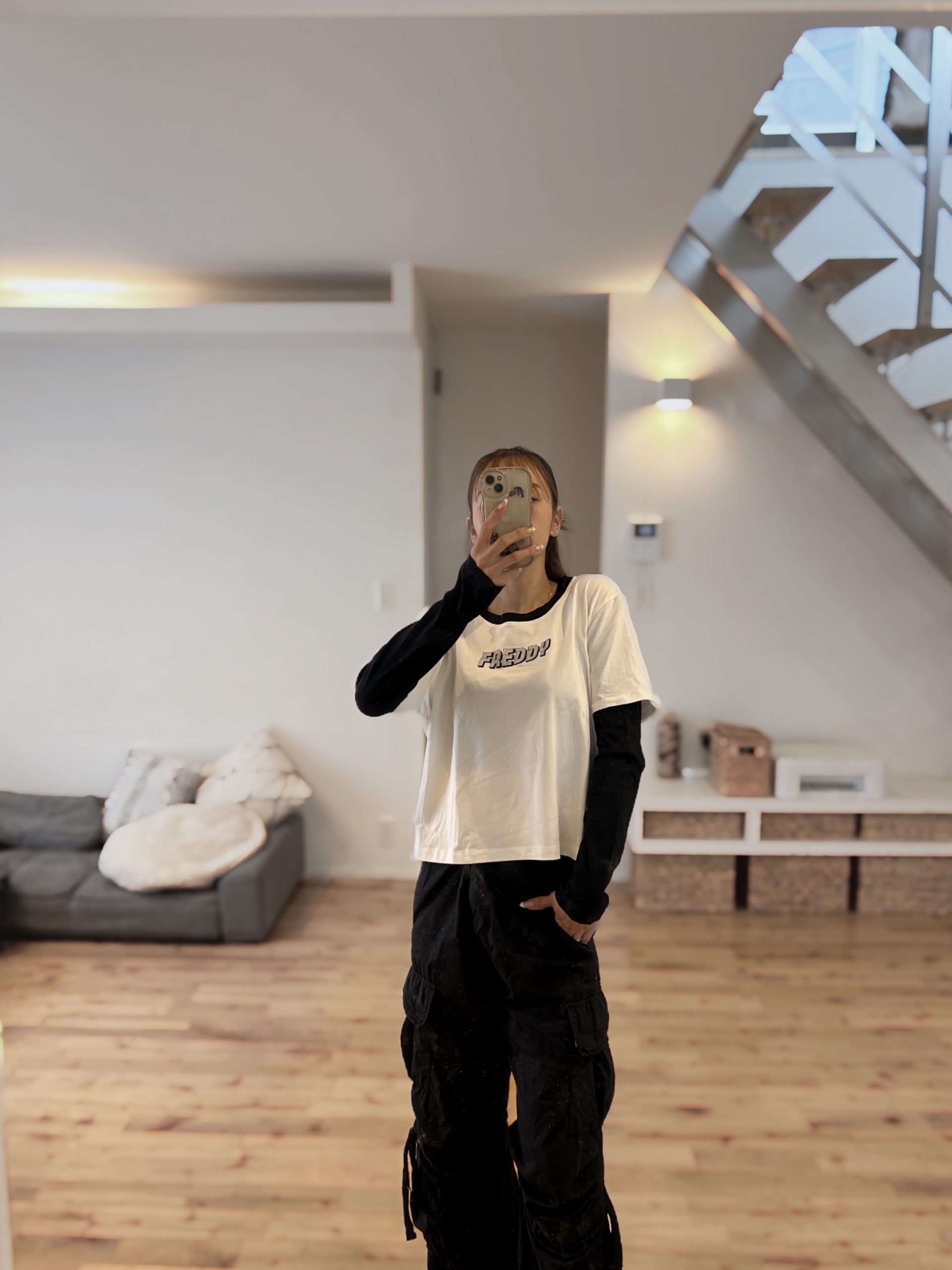 October 18, 2025 🤍🖤🤍 重ね着風ロングTシャツ〜🤍🖤かわ ちょっとプクッと立体感のあるロゴもお気に入り🖤 どっちの色にしようかだーいぶ悩んでホワイトにしたけど、ブラックも可愛かったなぁ…🥺🖤 ブラックならまだ在庫ありです!! お早めにどうぞ〜!! クーポンコード:FR901(FREDDY商品購入時にクーポンコードを入力していただくと5%OFFになるのでぜひご利用ください♪) ロングTシャツ